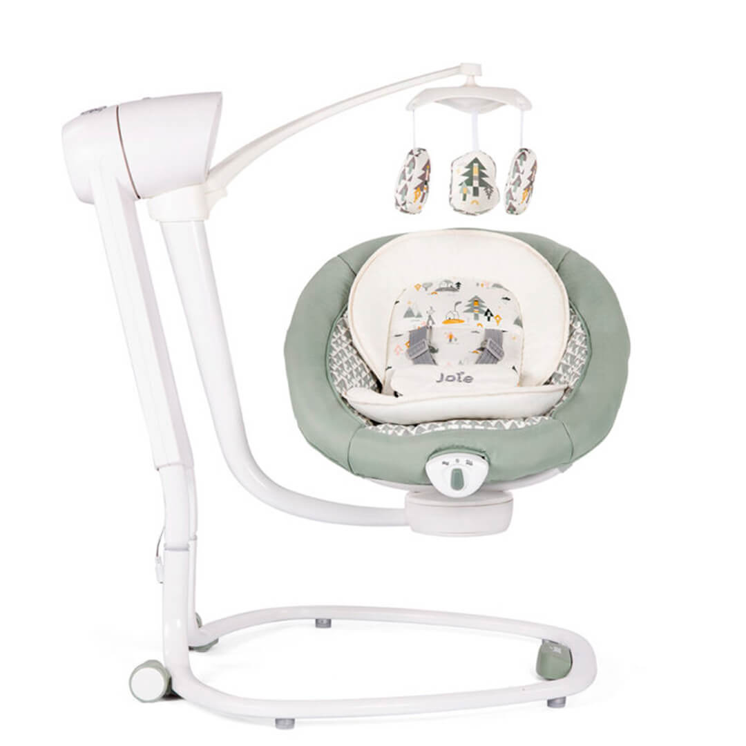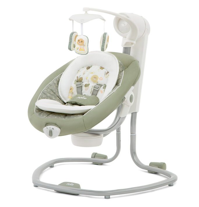 Dual motion seat swings front to back or side to side with a simple twist 5 classical lullabies and 5 nature sounds pair with vibration and 3-position recline to sooth while swaying Integrated wheels and compact frame make moving from room to room a